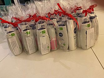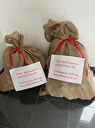 Die traditionelle Weihnachtsfeier für die Bewohner und ihre Angehörigen, die bisher vom Förderverein mitfinanziert wurde, konnte corona-bedingt nicht stattfinden. Trotzdem haben wir eine Möglichkeit gefunden, die Bewohnern mit einem Weihnachtsgeschenk zu überraschen. Weihnachtlich verpackt, mit einer roten Schleife versehen, wurden 40 Klarsichttüten mit 120 Kosmetikartikeln in zwei Jutesäcken präsentiert und während des Adventskaffees an die SeniorenInnen verteilt.